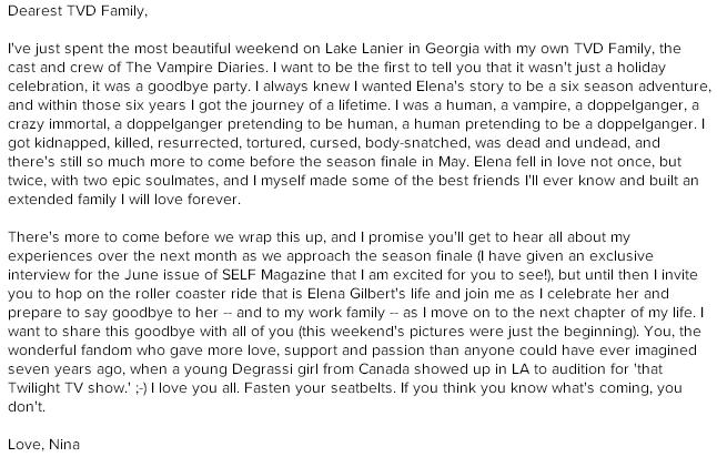 La finale de la sexta temporada de la serie, capítulo que tiene su emisión prevista para el próximo 14 de mayo será, por lo tanto, el último de la actriz interpretando a Elena Gilbert.