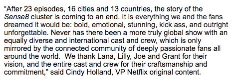 La decisión viene después de muchos rumores y una campaña en Twitter de sus fans bajo el lema #RenewSense8, campaña que a la que Netflix parece no haber hecho demasiado caso. El alto coste de producción que conlleva la serie es el principal motivo por el que se ha tomado dicha decisión.