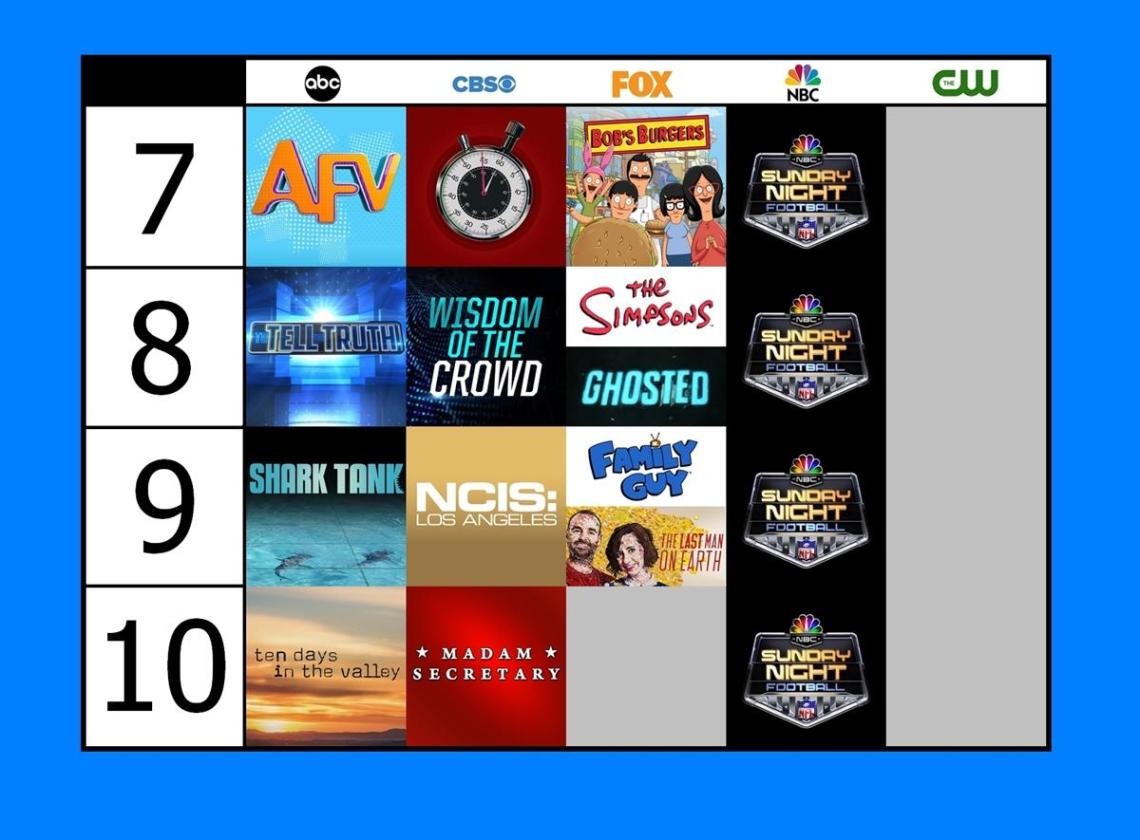 Última (o primera) noche de la semana según se mire. Pocos cambios nos encontramos respecto a la temporada pasada. Las adiciones de Wisdom Of The Crowd (CBS) y la renuncia casi total a emitir series por parte de ABC entran en lo más destacable. Con Ghosted parece que FOX fortalecerá algo más su bloque, el cual sigue funcionando de forma bastante aceptable salvo por las discretas audiencias de The Last Man On Earth. Por su parte, tenemos un interesante movimiento en CBS, cadena que apuesta por mover a NCIS Los Angeles en busca de dar un mejor lead-in a su última franja, la cual ocupará este año Madam Secretary, otra de sus series con datos más bien discretos. Como cada año, la NBC emitirá NFL por lo que sólo nos queda ABC. Tras un par de temporadas en la que lanzar nuevas series les ha sido complicado, la cadena apuesta por un bloque de programación variada junto a Ten Days In The Valley a última hora. No lo tendrá fácil visto los antecedentes.