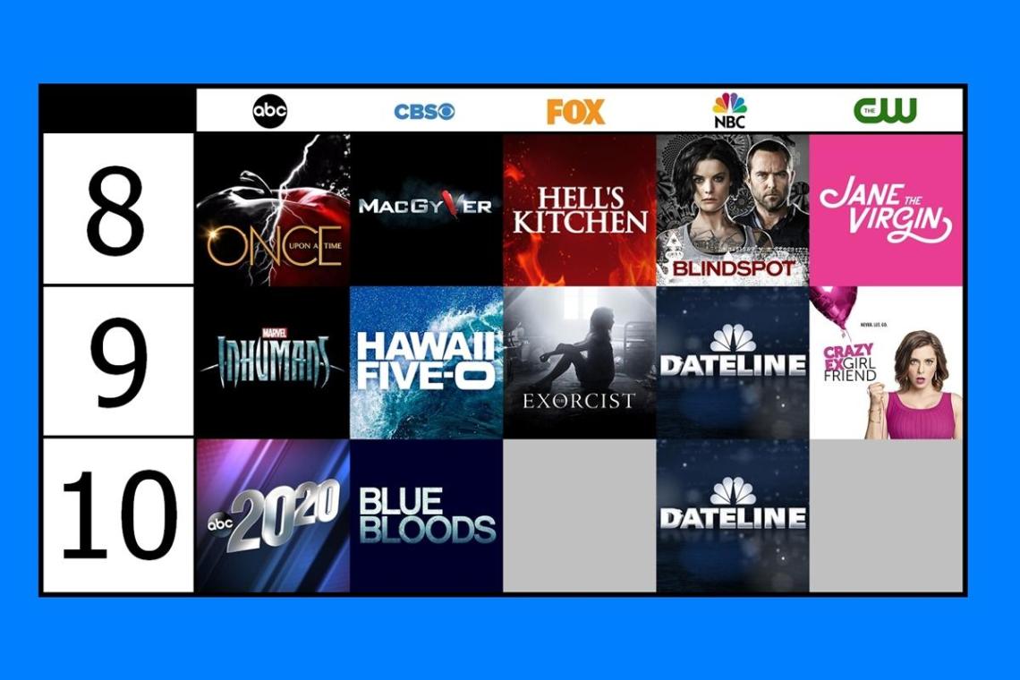 Para la que siempre había sido considerada una noche tranquila, este año nos encontramos con una larga lista de series, muchas de ellas debutantes en dicha noche. Para muchos un cementerio, para otros una oportunidad de rendir sin presiones, los viernes se vuelven muy interesantes. Once Upon a Time, The Inhumans y Blindspot pelearán con las habituales Hawaii 5.0 y Blue Bloods (más MacGyver) para hacerse un hueco. No necesitan mucha audiencia, así que el reto es asequible para ellas. De The Exorcist no esperamos gran cosa, aunque la temporada pasada nos dice que FOX le exige muy poco. En el otro lado, las series de CW también lucharán por mantenerse firmes.