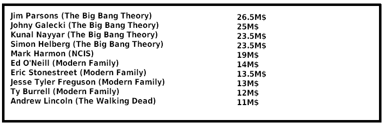 En cuanto a los actores, Jim Parsons (The Big Bang Theory) encabeza el ranking con unas ganancias estimadas de 26.5M de dólares, cifra ligeramente superior a las de sus compañeros de serie, gracias a su participación como productor en Young Sheldon. El trío formado por Johnny Galecki (25M$), Kunal Nayyar y Simon Helberg (23.5M$) completan el TOP5 junto a Mark Harmon (19M$), el cual protagoniza y produce NCIS, también en CBS. Detrás suyo nos encontramos con los cuatro protagonistas (masculinos) principales de Modern Family (ABC). Ed O’Neill (14M$), Eric Stonestreet (13.5M$), Jesse Tyler Ferguson (13M) y Ty Burrell (12M$) ocupan las posiciones del sexto al nueve de la lista. El TOP10 de los mejor pagados de este año lo completa Andrew Lincoln, actor que ha ganado unos 11M$ por su trabajo en The Walking Dead (AMC).