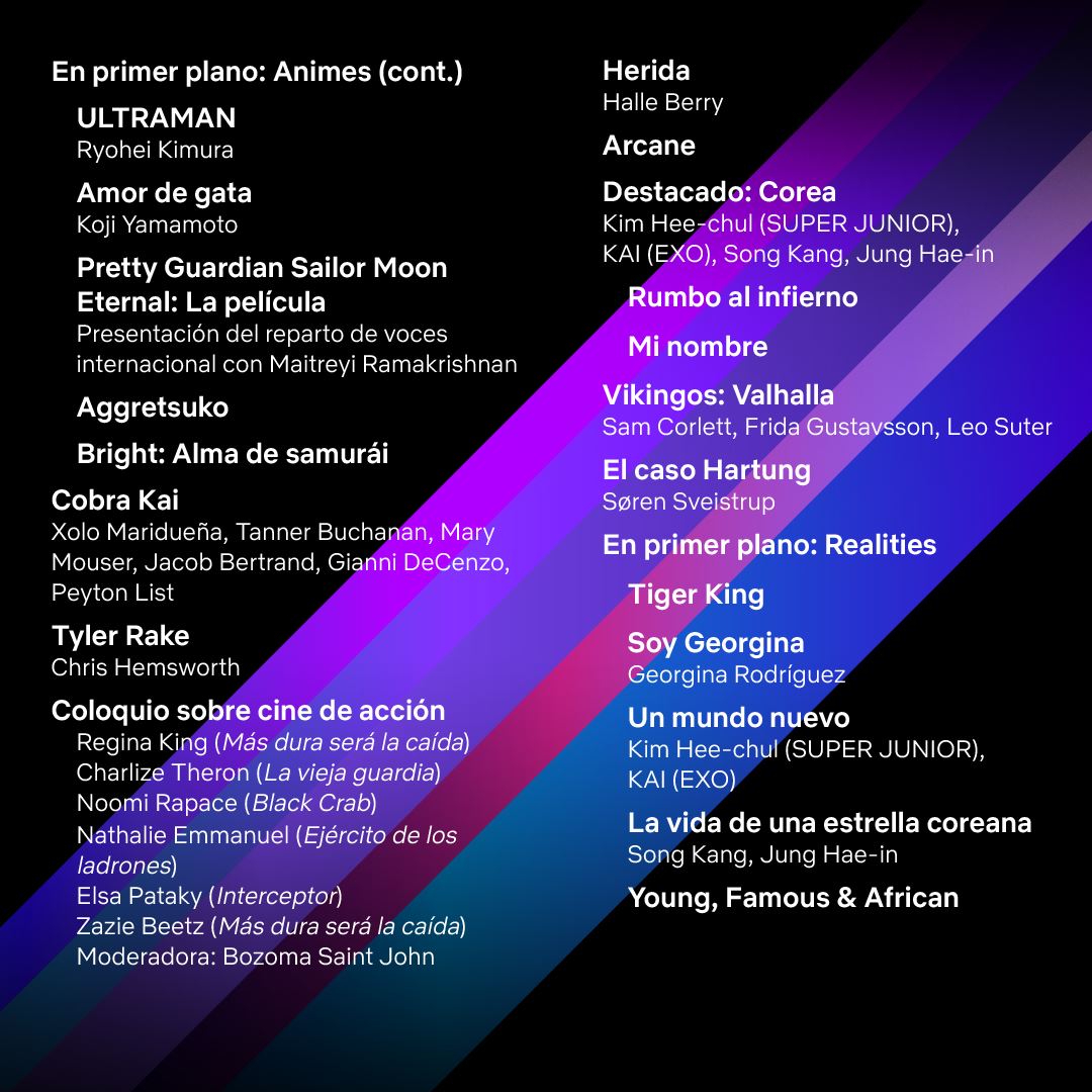 La humorista Lilly Singh será la presentadora de la primera hora, que incluye un clip exclusivo de la nueva película de acción Alerta Roja, avances de las temporadas más recientes de Birdgerton y Ozark, además de una sorpresa especial de Stranger Things. Las estrellas de esta última, Finn Wolfhard y Caleb McLaughlin se subirán al escenario en la segunda hora, cuando los fans disfrutarán de las primeras imágenes de Sandman, Vikings: Valhalla, y la cuarta temporada de Cobra Kai, además de un coloquio con las estrellas de cine de acción de Netflix -Charlize Theron, Regina King y Zazie Beetz, entre otras- moderado por su directora de Marketing Global: Bozoma Saint John.
