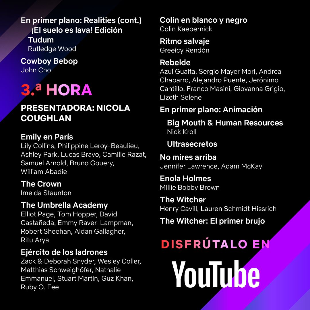 La actriz Nicola Coughlan (Bridgerton) será la maestra de ceremonias de la tercera y última hora del evento, en la que dará algunas noticias fascinantes: desde el primer avance y el anuncio de la fecha de estreno de la segunda temporada de Emily in Paris hasta un saludo especial de la nueva reina de The Crown, pasando por un clip especial de la nueva película Don’t Look Up (No mires arriba). También se mostrará un vídeo de detrás de las cámaras con el reparto de The Umbrella Academy, el estreno del tráiler de Army of Thieves —la precuela de Army of the Dead— y los avances y últimas noticias de The Witcher.