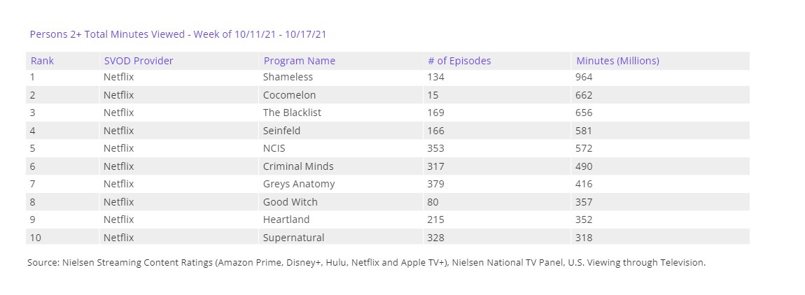 Cambiamos de líder. Shameless (Netflix) entra directa al primer puesto de la lista de adquisiciones (no originales) coincidiendo con su adición al catálogo americano de la plataforma. CoComelon (Netflix) se mantiene como segunda más vistas de la semana seguida de The Blacklist (Netflix), novedad de la anterior.