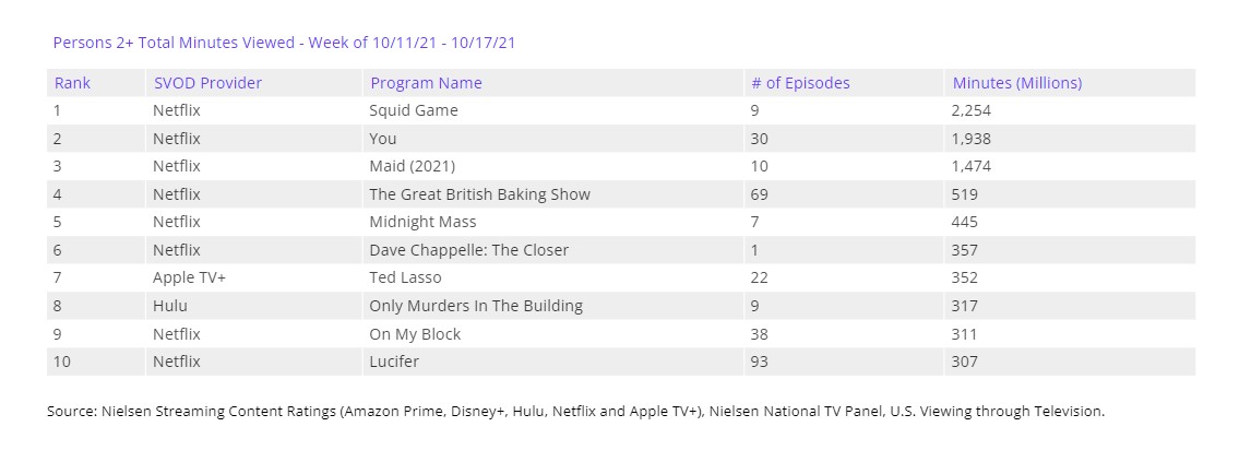 Una semana más, ya tenemos disponibles las audiencias de los principales servicios de streaming recogidas por Nielsen, misma empresa que se encarga de recopilar los números de la televisión americana. Como siempre, recordar que estas audiencias tardan cuatro semanas en calcularse, por lo que, por ejemplo, los números de la primera semana de noviembre no estarán disponibles hasta la primera semana de diciembre.