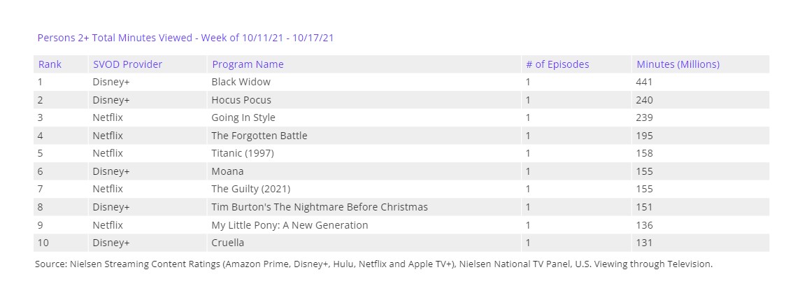 Por segunda semana, Black Widow (Disney+) repite como película más vista en Estados Unidos. Completan el podio Hocus Pocus (Disney+), película que imagino que habrá sido añadida de cara al estreno de su secuela, y el film de 2017 Going in Style (Un golpe con estilo) en Netflix.