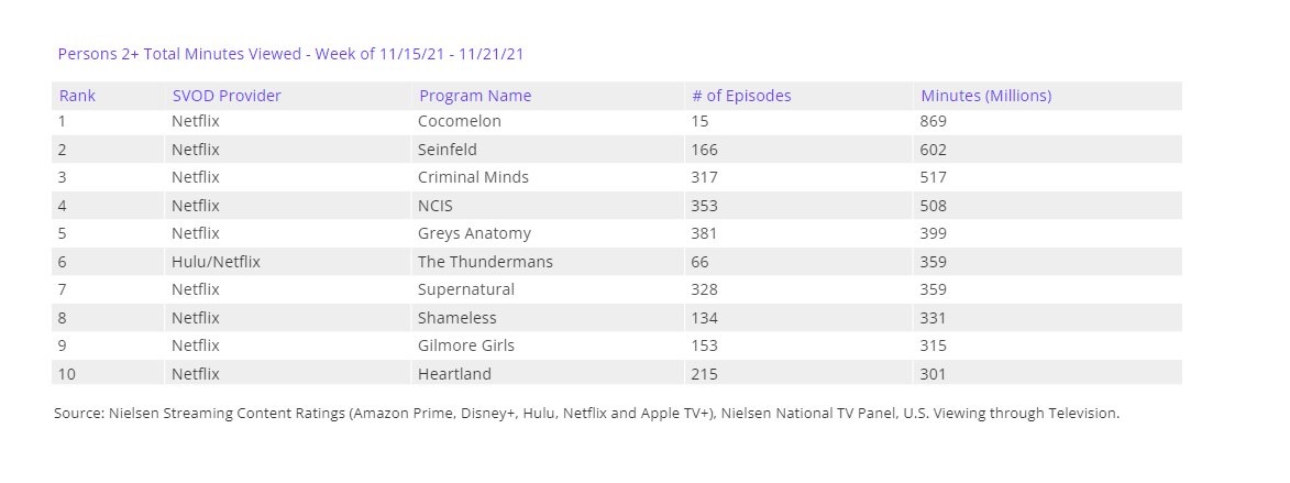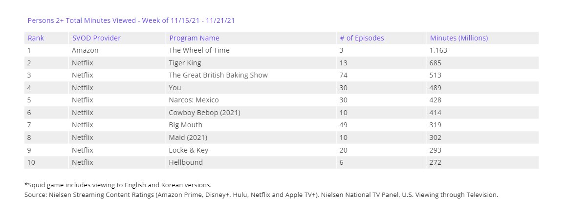 A día de hoy, Nielsen solo trabaja con Amazon, Apple TV+, Disney+, Hulu y Netflix y lo hace SOLO EN EEUU. Dato muy importante. ¿Cómo se calculan estos rankings? Bien, es más sencillo de lo que parece: se suman el total de minutos de visionado -durante esa semana- de una serie o película a partir de los dos minutos de reproducción de la misma. Solo se computa lo visto en televisión, ni dispositivos móviles, ni ordenadores. No es un sistema ni mucho menos perfecto pero si que es un primer paso dentro de lo que muchos llevamos tiempo esperando, conocer las audiencias de las series originales de las plataformas de streaming.