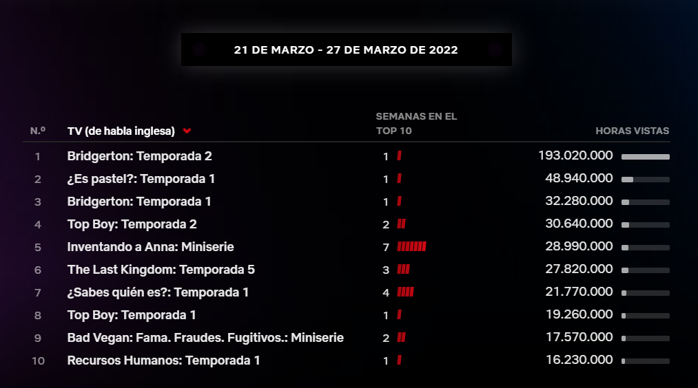 Tal y como recogen los datos publicados este martes por Netflix, tenemos nuevo récord para una serie de habla inglesa en los tres días posteriores a su estreno. Con 193 millones de horas reproducidas, Bridgerton supera ampliamente la marca establecida por la segunda temporada de The Witcher en diciembre 2021 (142.4M).
