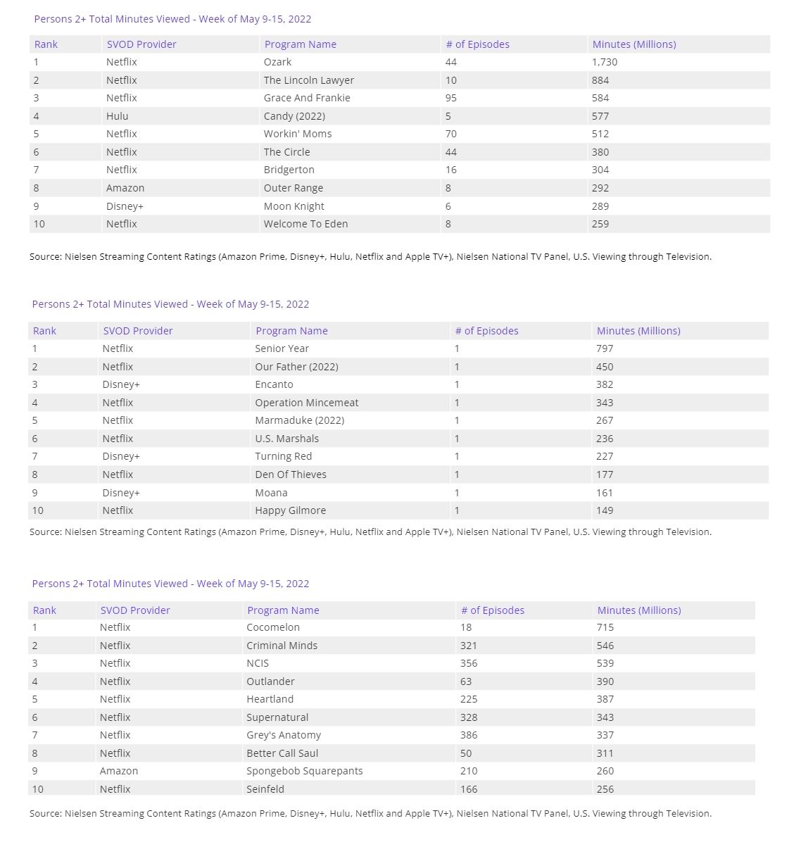 Sin novedades al frente, Ozark (Netflix) mantiene el liderato de la lista de originales sumando casi 1.730 millones de minutos a su cuenta. Confirmado el éxito de The Lincoln Lawyer (Netflix), la cual entra directa al segundo puesto de la misma en la semana de su estreno, justo por encima de Grace and Frankie (Netflix), completando el podio. Destacar tanto los buenos números logrados por Candy (Hulu) como por Bienvenidos a Edén (Netflix), primera serie española que logra entrar en lista desde el final de La casa de papel (Netflix). Se mantienen en el ranking las ya terminadas Outer Range (Prime Video) y Moon Knight (Disney+), confirmando también su buena recepción.