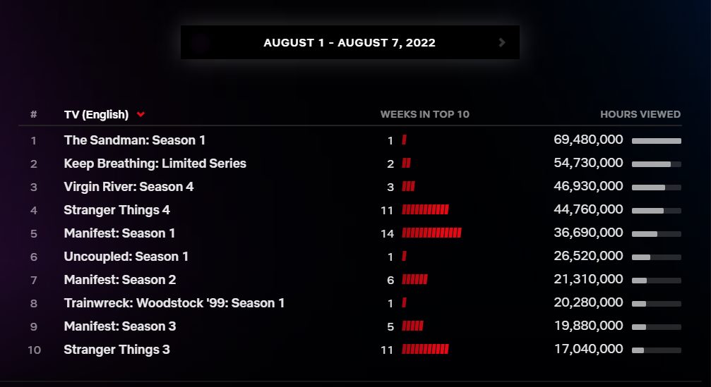 Tal y como se esperaba, The Sandman ha sido la serie de habla inglesa más vista de Netflix en los tres días posteriores al estreno de su primera temporada. La ficción cosechó en dicho periodo un total de 69.4 millones de horas reproducidas, una cifra que no es ni mucho menos espectacular pero que debería ser más que suficiente para garantizar su continuidad. Tal y como es habitual, la semana que viene esperamos que sus números suban sustancialmente, reflejando bastante mejor su acogida entre los suscriptores de la plataforma.