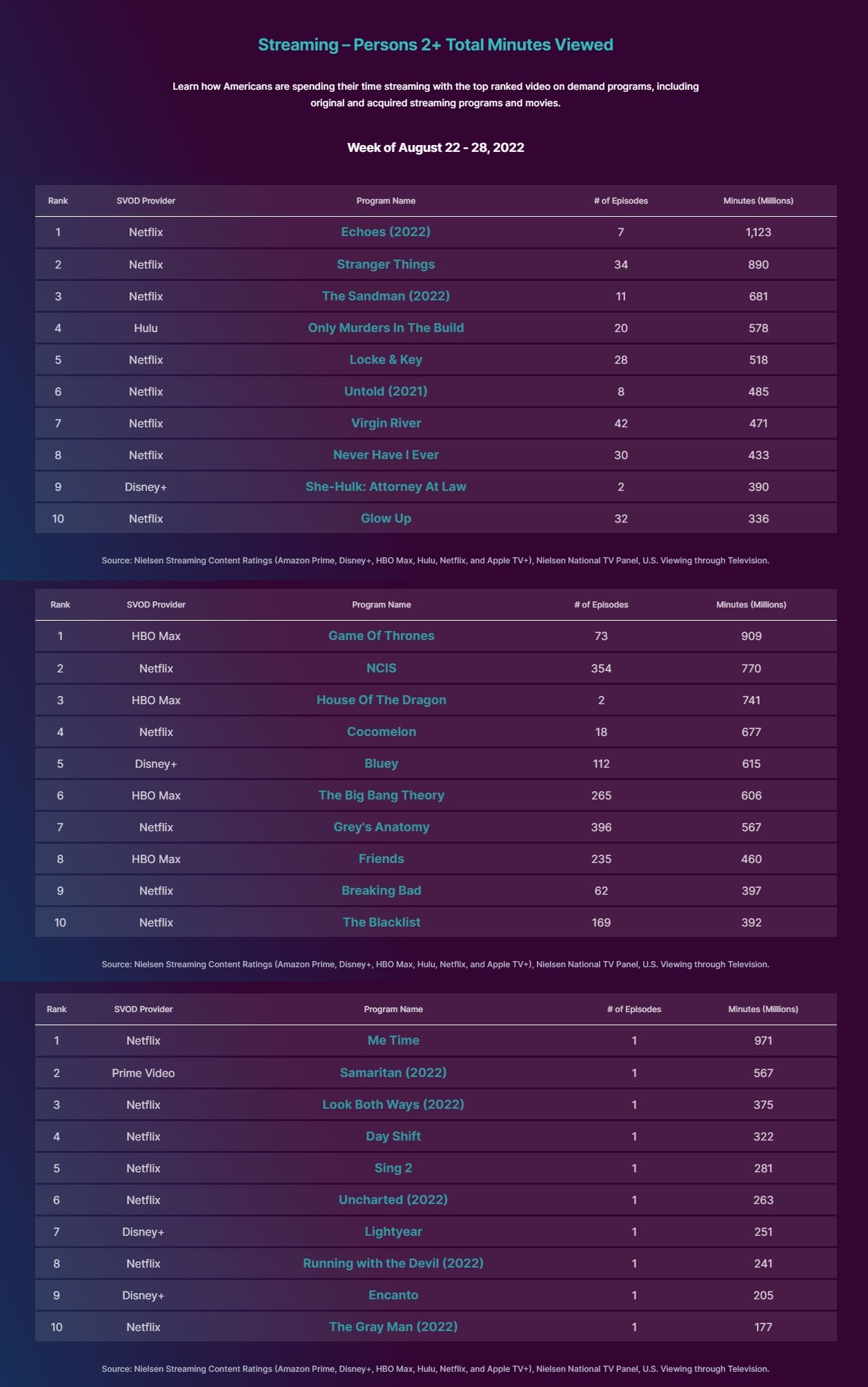 Los dragones también empiezan a ser tendencia en el ranking semanal de Nielsen. La gran sorpresa es la recién estrenada House of the Dragon (HBO Max) la que lidera el ranking, sino la Game of Thrones (HBO Max) original, la cual, tal y como señalábamos la semana pasada, ha empezado a sumar millones y millones de minutos reproducidos a raíz del estreno de su precuela. La nueva serie de HBO debuta oficialmente en la lista de adquisiciones con 741M de minutos, una cifra muy destacable, más si tenemos en cuenta que estas audiencias se calculan de lunes a domingo, por lo que prácticamente la totalidad de ese metraje sería de su primer episodio.