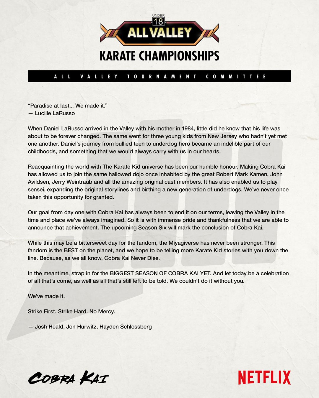 Otra que termina. Netflix ha anunciado hoy viernes una última renovación para Cobra Kai, la cual terminará con la que será su sexta temporada. La noticia se ha hecho pública a través de las redes sociales de la plataforma, publicando además la carta escrita por sus creadores que encontraréis al final del texto. Tal y como se ha venido rumoreando recientemente, nadie descarta que la franquicia pueda continuar con algún spinoff.