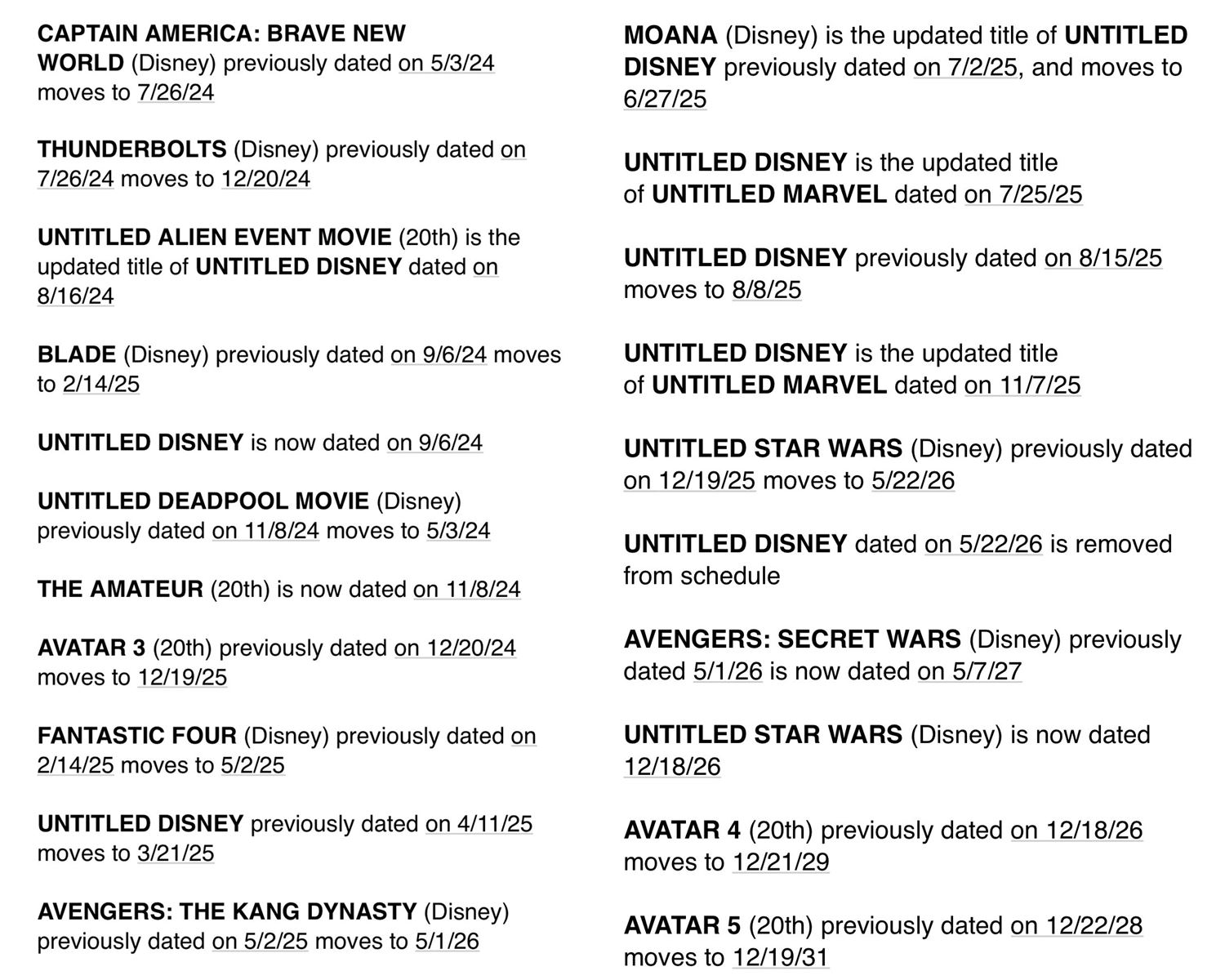 Por un lado, la compañía dirigida por Kevin Feige atrasa todas sus películas anunciadas, desde Captain America: Brave New World hasta Avengers: Secret Wars. Solo hay uno de sus múltiples proyectos que cambia su fecha hacía adelante y esa es Deadpool 3, la cual pasa del 8 de noviembre 2024 al 3 de mayo 2024. Mirando el lado positivo, esta es una buena oportunidad para seguir mejorando y dándole forma a una saga que poco a poco empieza a salir de su reciente bache creativo. Por otro, Avatar 3 se retrasa un año, al 19 de diciembre de 2025, mientras que sus secuelas atrasan tres años su lanzamiento. La franquicia comenzada en 2009 terminará en 2031, 22 años después. Los cambios también afectan a las nuevas películas de Star Wars y a otras que repasamos a continuación.